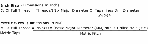As a general rule, the tougher the material, the less the percentage of thread is needed to create a hole strong enough to do the job for which it was intended. In some harder materials such as stainless steel, Monel, and some heat-treated alloys, it is possible to tap to as little as 50% of full thread without sacrificing the usefulness of the tapped hole.